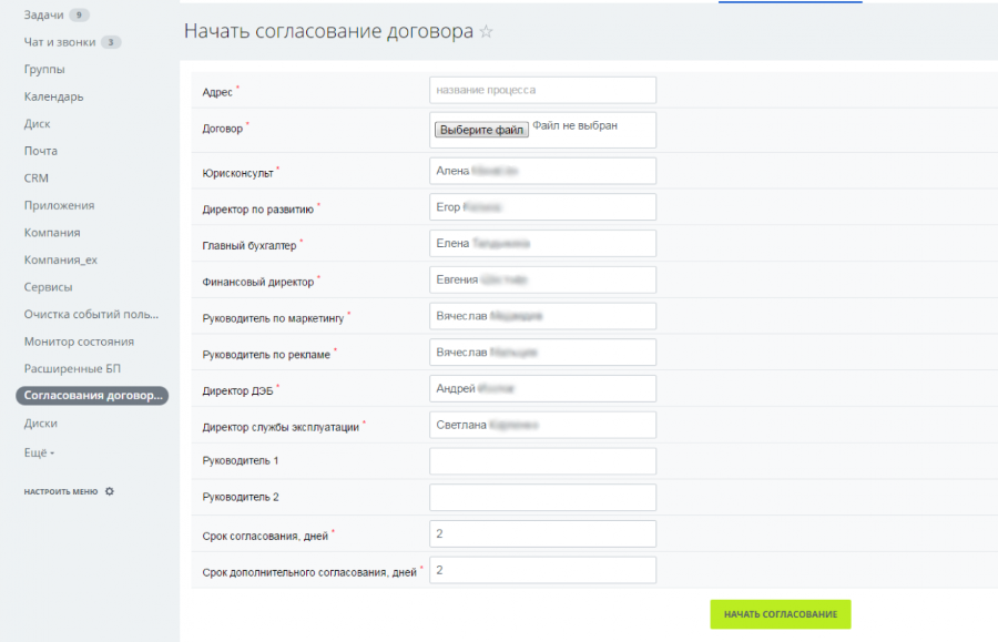 Начинается бизнес-процесс согласования договора с указания названия, приложения файла договора и назначения ответственных.По умолчанию, при старте согласования договора уже выбраны сотрудники, наиболее часто выполняющие обязанности согласующих. Но при необходимости ответственных можно изменить.