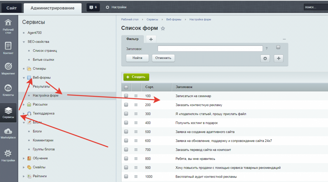 Если ваш сайт сделан на CMS Битрикс, есть вероятность, что интеграция пройдёт быстро и легко. Для этого надо проверить, как сделаны формы обратной связи. Если вы видите их в разделе Сервисы — Веб-формы, значит вам повезло.