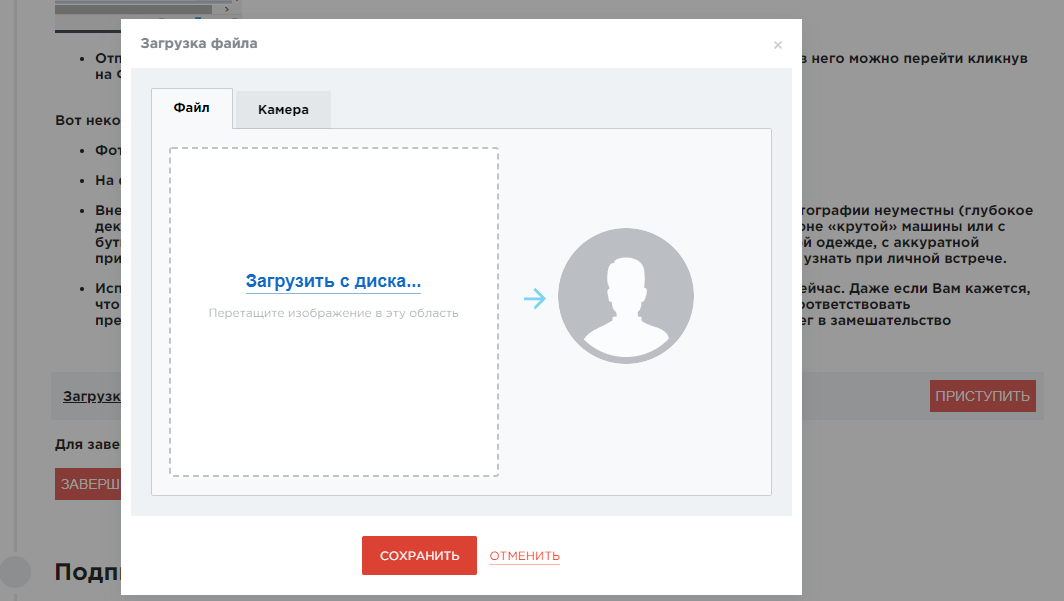 Для выполнения таких заданий необходимо выполнить какие-либо действия на портале. Например, загрузить фото в профиль пользователя. Для того, чтобы выполнить данное действие пользователь нажимает на кнопку Приступить. В результате открывается веб форма, в которую он должен прикрепить свою фотографию. После чего загруженное фото отобразится на странице в его профиле, а этап будет отмечен как выполненный.