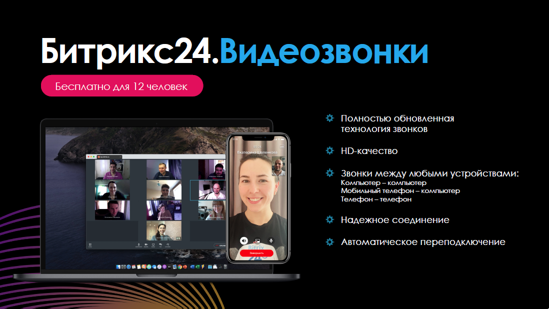 Теперь в групповом видеочате Битрикс24 можно собрать до 12 человек. И речь идет не только о коллегах, но и о клиентах: обновление Битрикс24.Лондон позволяет создавать видеоконференции и приглашать внешних участников по ссылке. Качество видеозвонков значительно улучшилось.