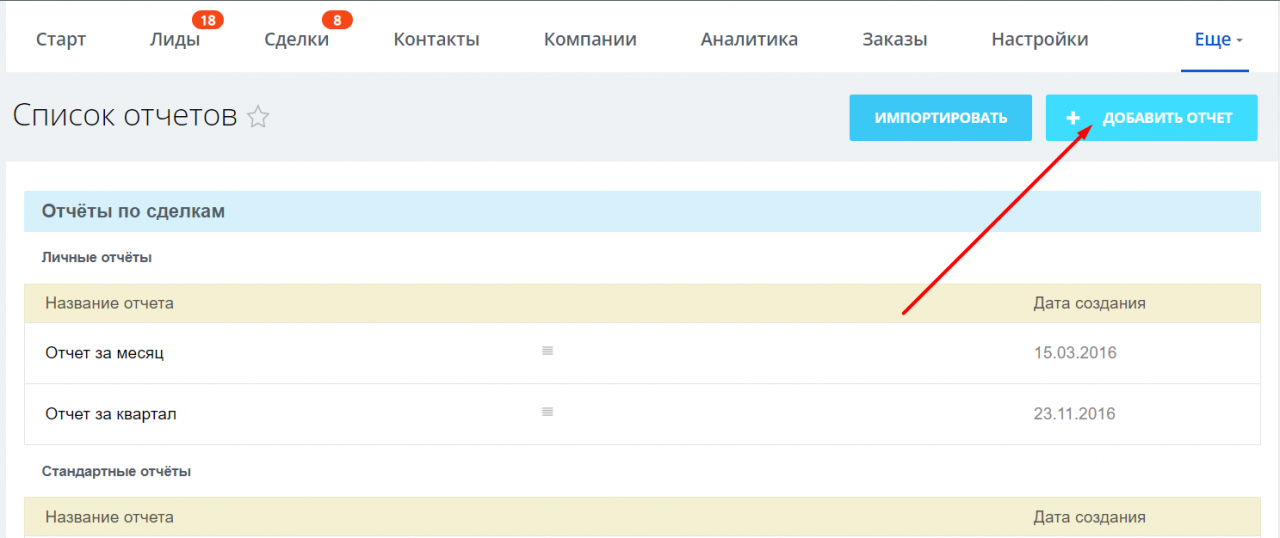 Для построения отчетов за период времени использовать фильтр в CRM неудобно. Для создания таких отчетов используется специальный конструктор отчетов.Рассмотрим пример. Требуется построить отчет, в котором отображается число новых лидов, созданных сотрудниками за неделю. Выбираем раздел «Отчеты»: