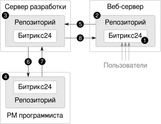 Ключевую роль здесь играет репозиторий, находящийся на сервере разработки (рис. 8-3). Во-первых, в него передаются результаты работы SiteUpdate (рис. 8-5), которые «забирают» программисты (рис. 8-6). Последние выполняют слияние, разрешают конфликты, выполняют исправления в доработках, если происходят изменения программного интерфейса 1С-Битрикс, тестируют систему. После того, как перечисленные работы завершены, на сервер разработки попадает готовая к развертыванию версия Битрикс24. Затем она переносится на веб-сервер.