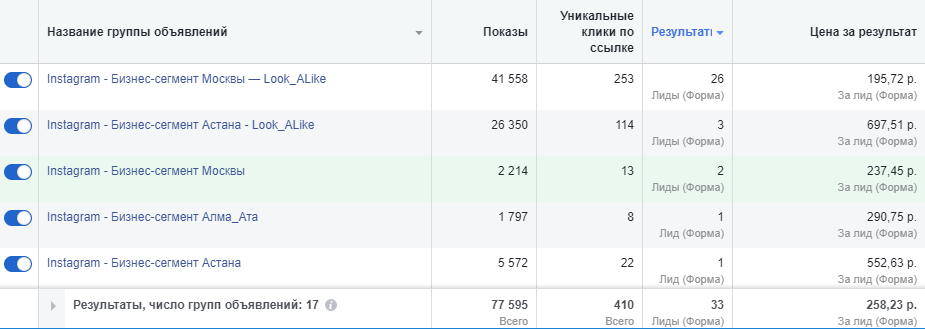 | Instagram - Бизнес-сегмент Москвы | 45 155 | 570 | 16 382,91 | 42 | 390,07 |