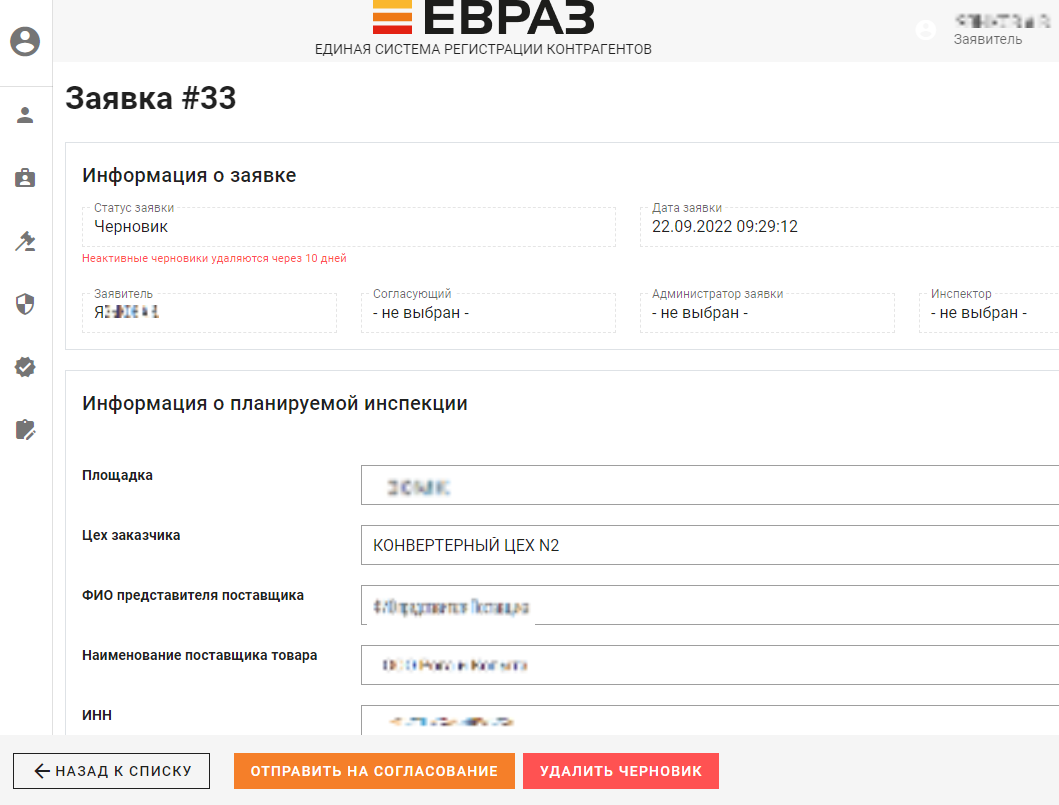 сначала заявку “одобряет” Согласующий – сотрудник, отвечающий за все инспекции;