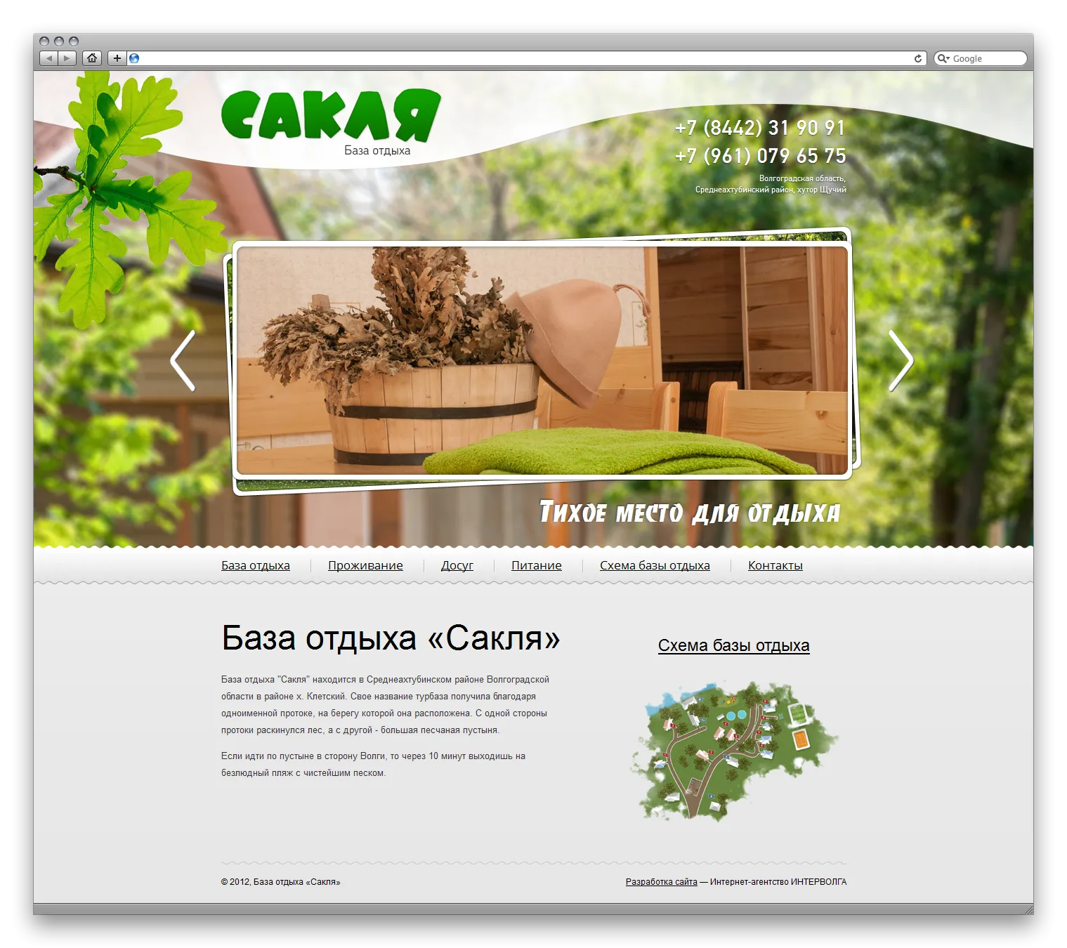 Разработка сложного сайта-каталога базы отдыха со всеми предлагаемыми услугами и схема с отображением домиков, кафе, площадок для отдыха, речки и т.д. Использование в дизайне сайта фотографий с пейзажами базы отдыха и, как интересный элемент добавлена веточка дуба, которые растут по всей территории.Результат