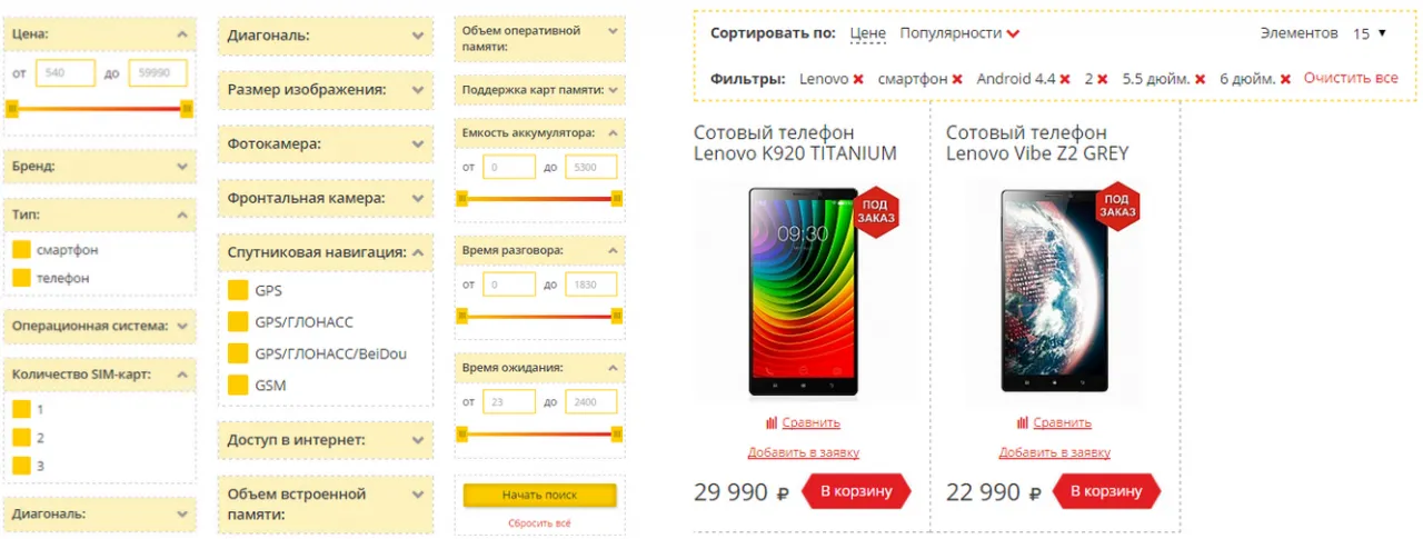 - Умный и быстрый фильтр. Смартфоны и электронная техника, как любой технически сложный товар обладает огромным количеством характеристик. Ориентироваться в них поможет фильтр. А для новичков подготовлены специальные наборы готовых фильтров. Например, "2-х симочные" покажет устройства с двумя симками, а "Бюджетные" - телефоны до 3000 руб. и т.д.